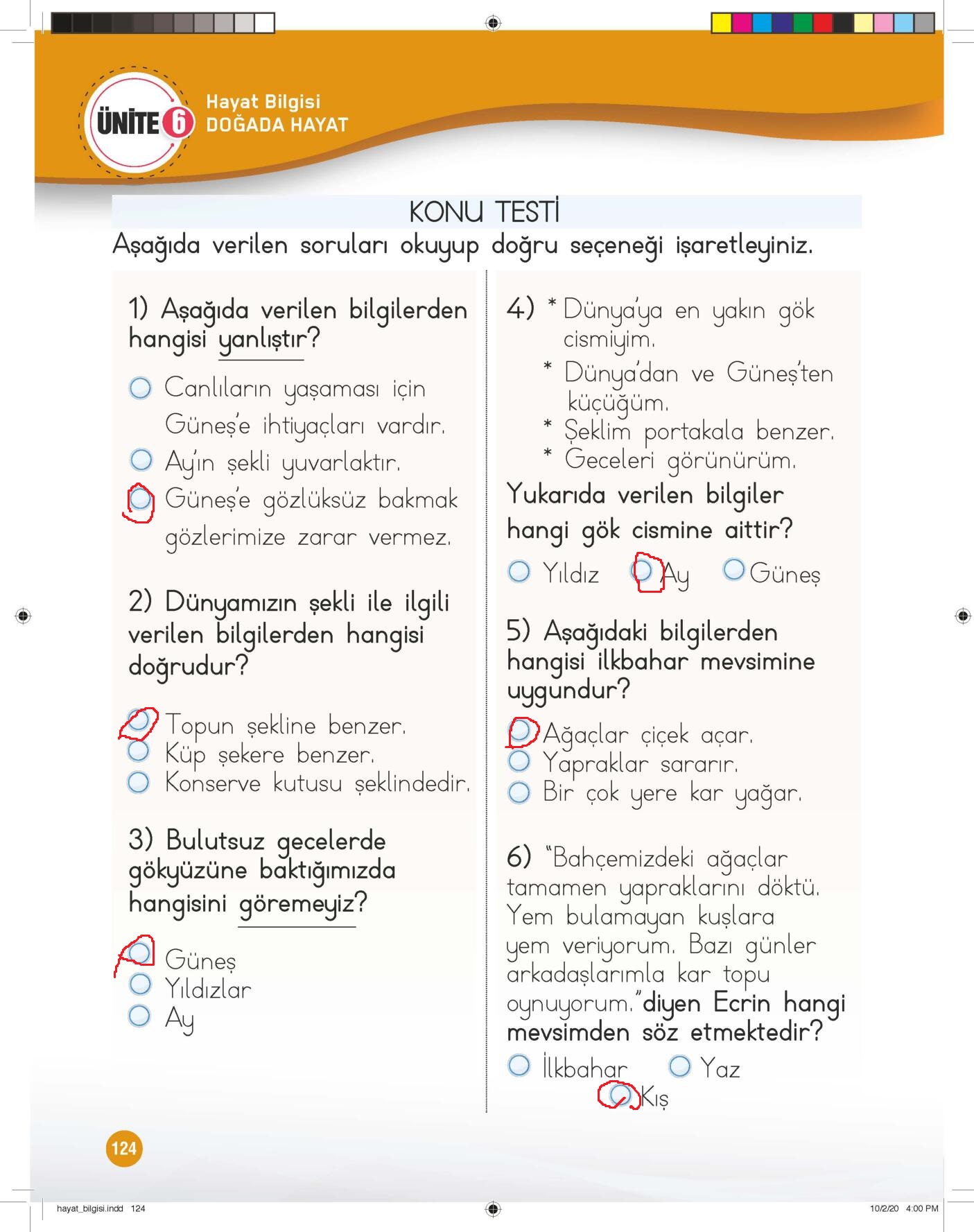 1. Sınıf Hayat Bilgisi Çalışma Kitabı (1. Kitap) Meb Yayınları Sayfa 124 Cevapları / Cevabı