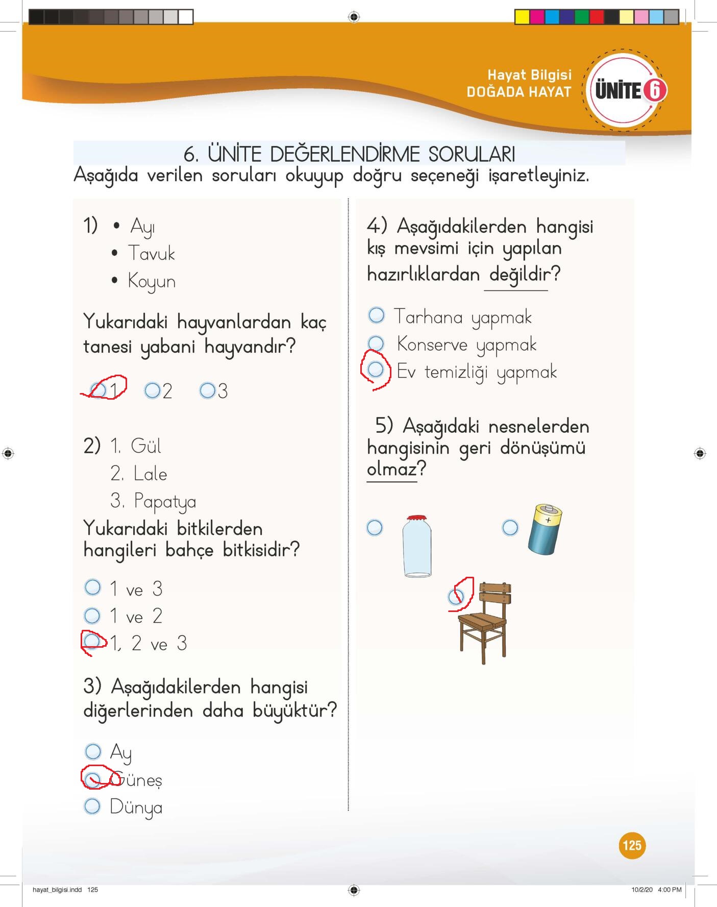 1. Sınıf Hayat Bilgisi Çalışma Kitabı (1. Kitap) Meb Yayınları Sayfa 125 Cevapları / Cevabı