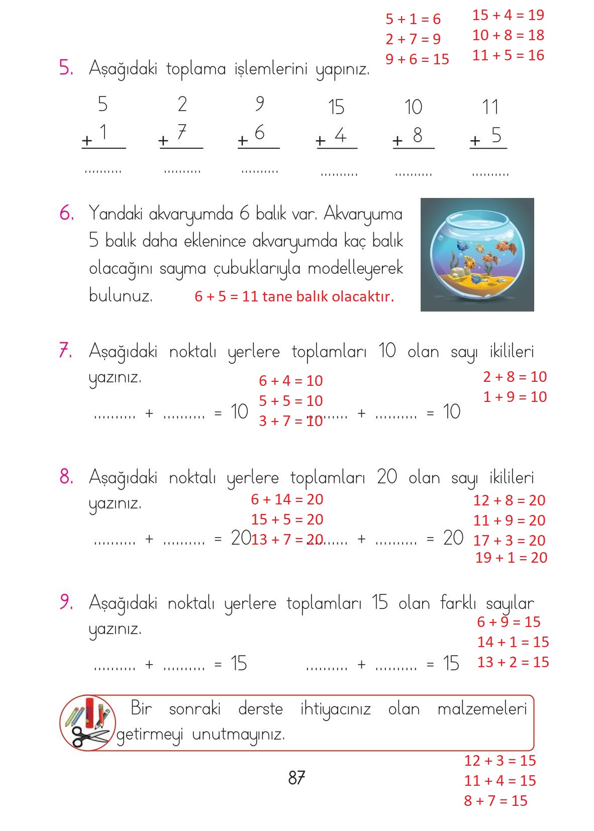1. Sınıf Matematik Açılım Yayınları Sayfa 87 Cevapları / Cevabı