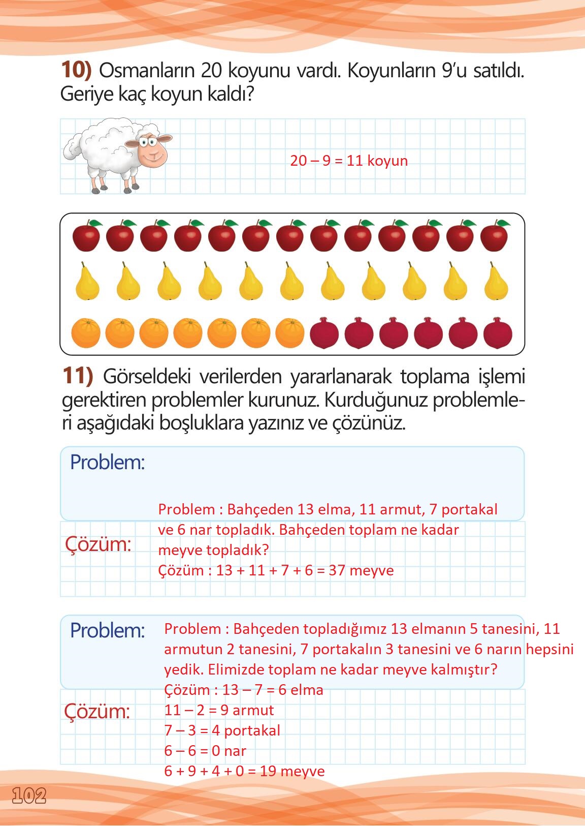 1. Sınıf Matematik Çalışma Kitabı (1. Kitap ) Meb Yayınları Sayfa 102 Cevapları / Cevabı