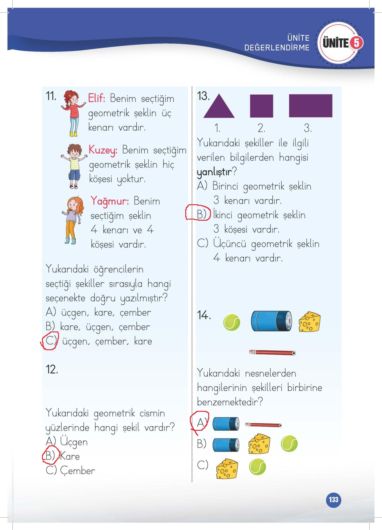 1. Sınıf Matematik Çalışma Kitabı (2. Kitap) Meb Yayınları Sayfa 133 Cevapları / Cevabı