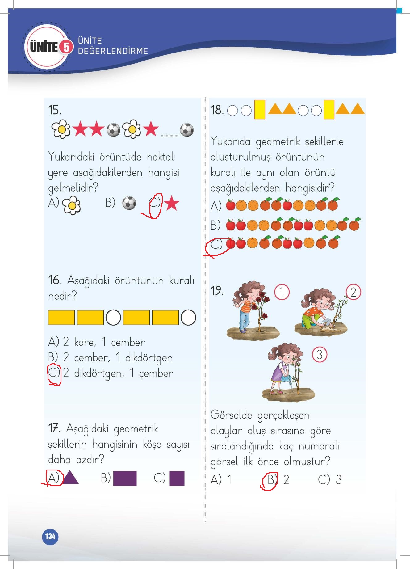 1. Sınıf Matematik Çalışma Kitabı (2. Kitap) Meb Yayınları Sayfa 134 Cevapları / Cevabı