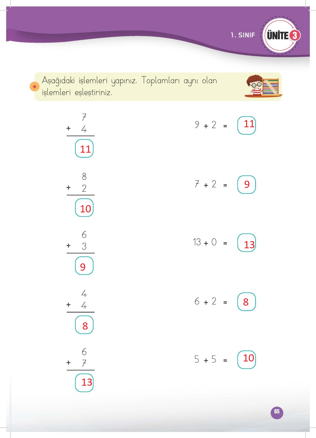 1. sınıf matematik çalışma kitabı meb yayınları sayfa 65 cevap anahtarı 2022-2023 sayfa olarak çözümlerini yanıtları sizler için aşağıda sunduk. 2025-2026 meb yayınları matematik çalışma kitabı cevapları yine sitemizde olacak.