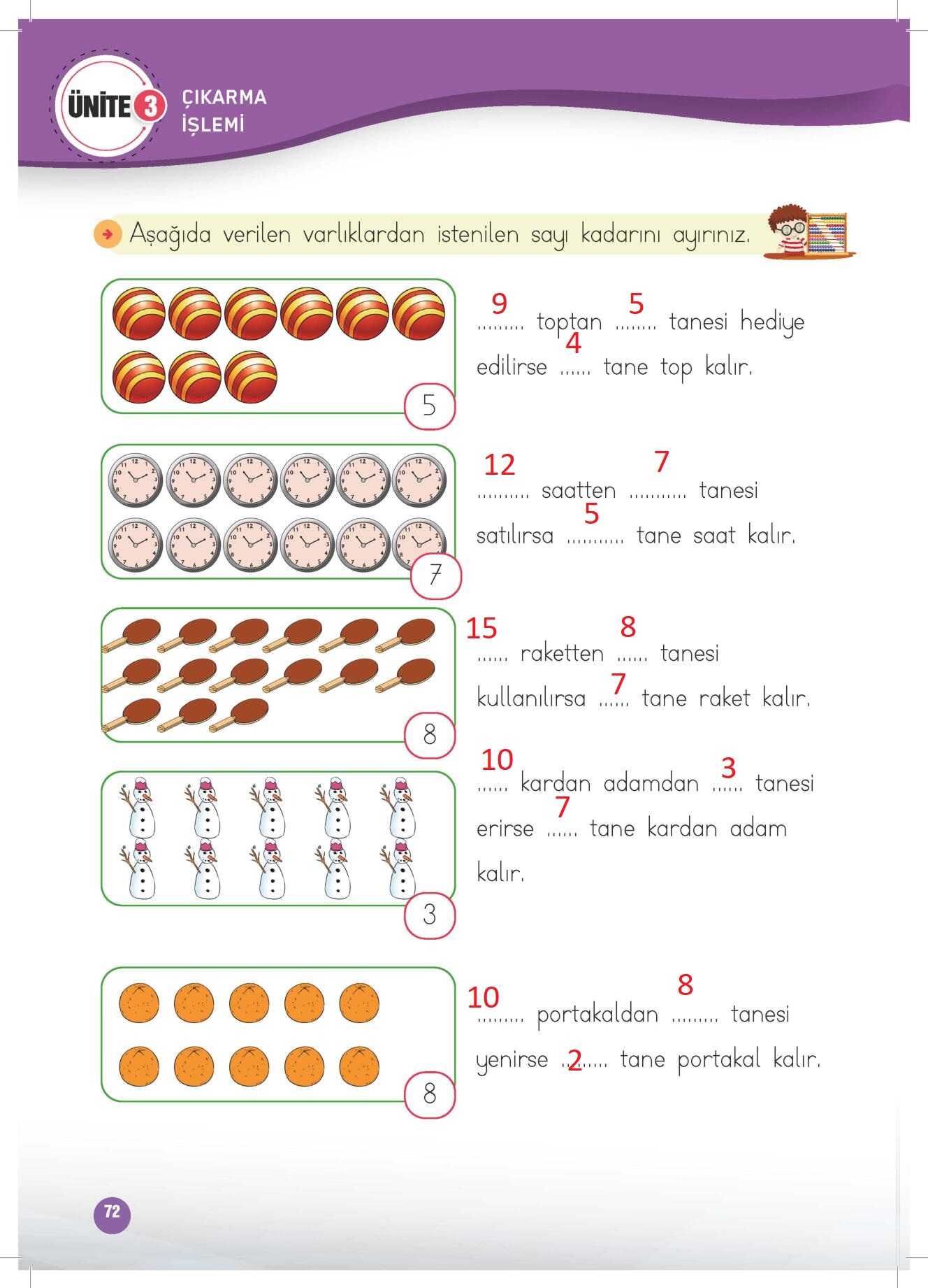 1. Sınıf Matematik Çalışma Kitabı (2. Kitap) Meb Yayınları Sayfa 72 Cevapları / Cevabı