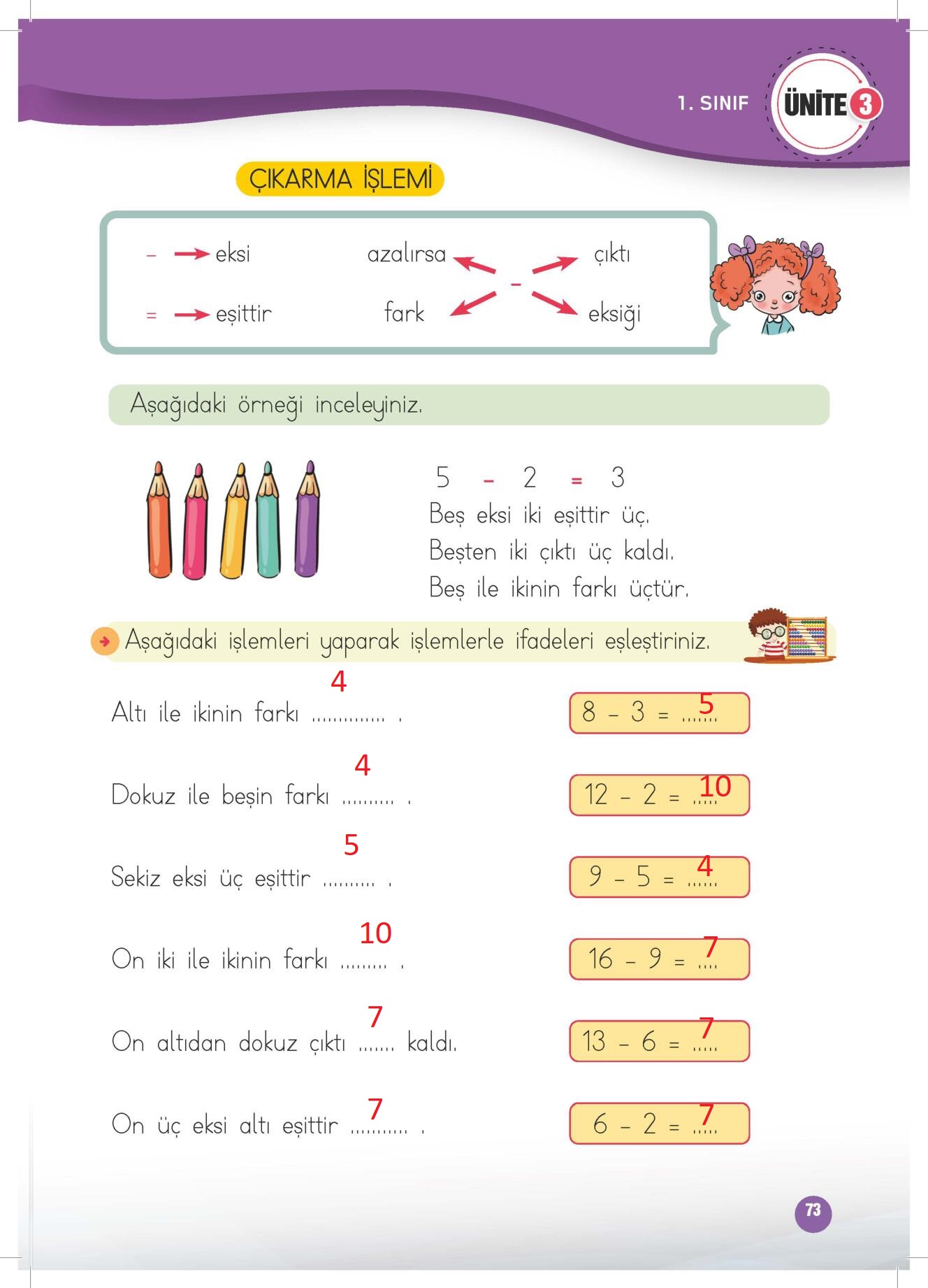 1. sınıf matematik çalışma kitabı meb yayınları sayfa 73 cevap anahtarı 2022-2023 sayfa olarak çözümlerini yanıtları sizler için aşağıda sunduk. 2025-2026 meb yayınları matematik çalışma kitabı cevapları yine sitemizde olacak.