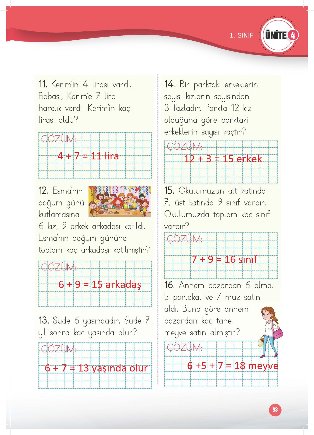 1. Sınıf Matematik Çalışma Kitabı (2. Kitap) Meb Yayınları Sayfa 93 Cevapları / Cevabı