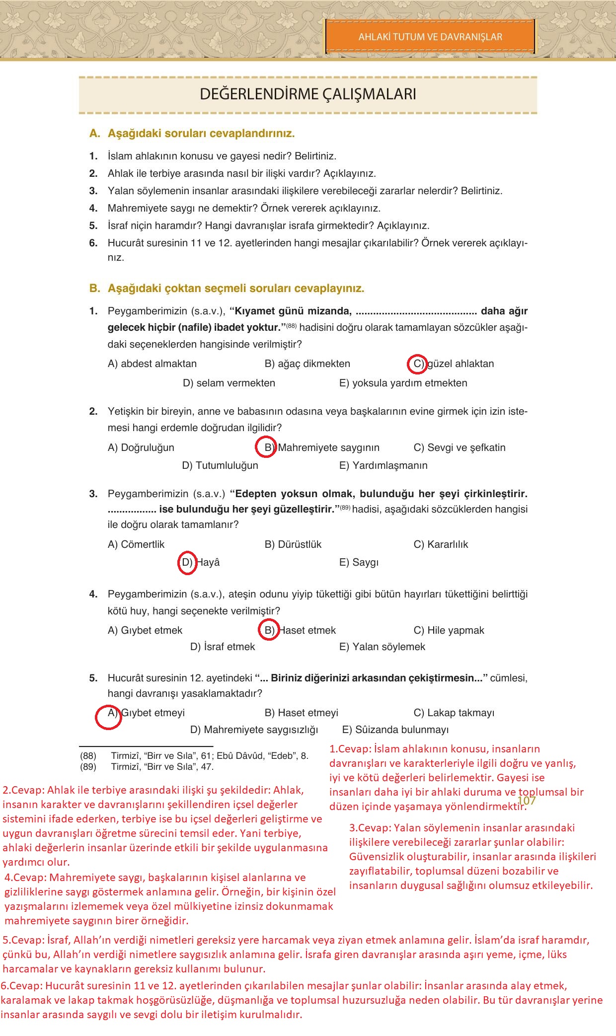 10. Sınıf Din Kültürü ve Ahlak Bilgisi Ders Kitabı Bilim ve Kültür Yayınları Sayfa 107 Cevapları