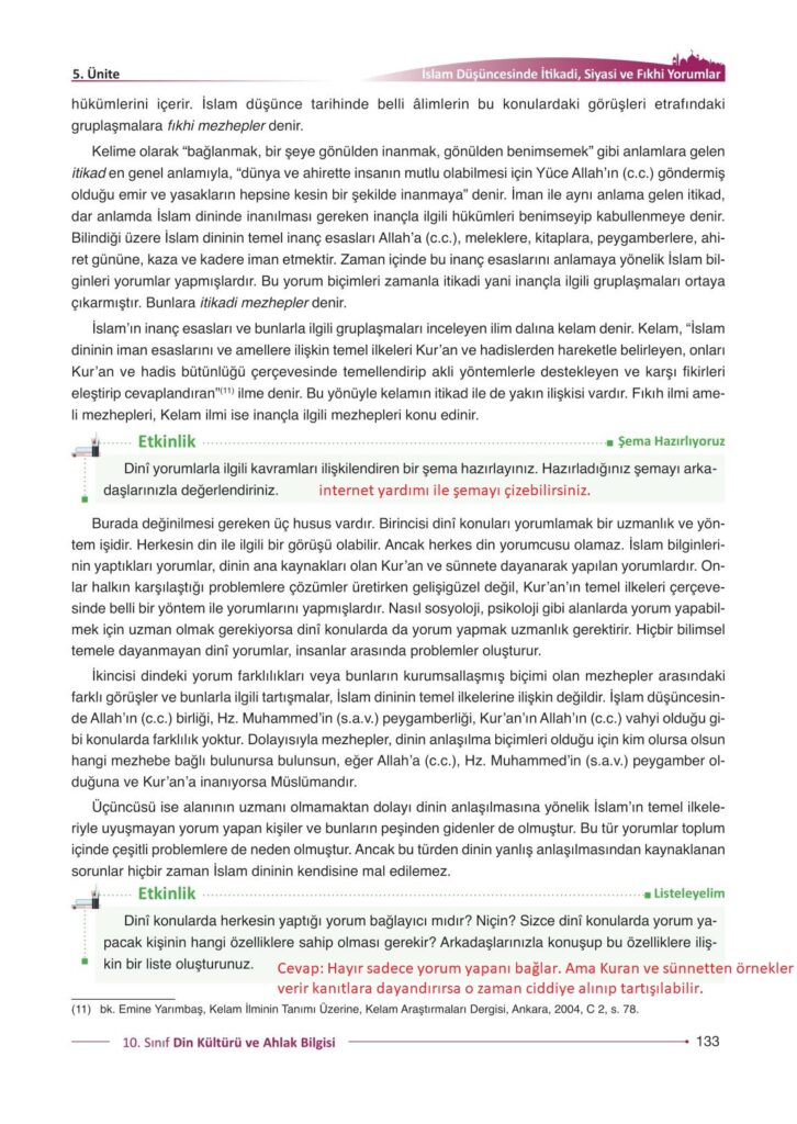 10. Sınıf Din Kültürü ve Ahlak Bilgisi Gezegen Yayıncılık Sayfa 133 Cevapları / Cevabı