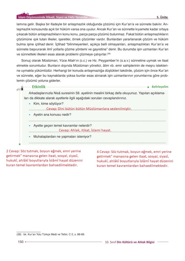 10. Sınıf Din Kültürü ve Ahlak Bilgisi Gezegen Yayıncılık Sayfa 150 Cevapları / Cevabı