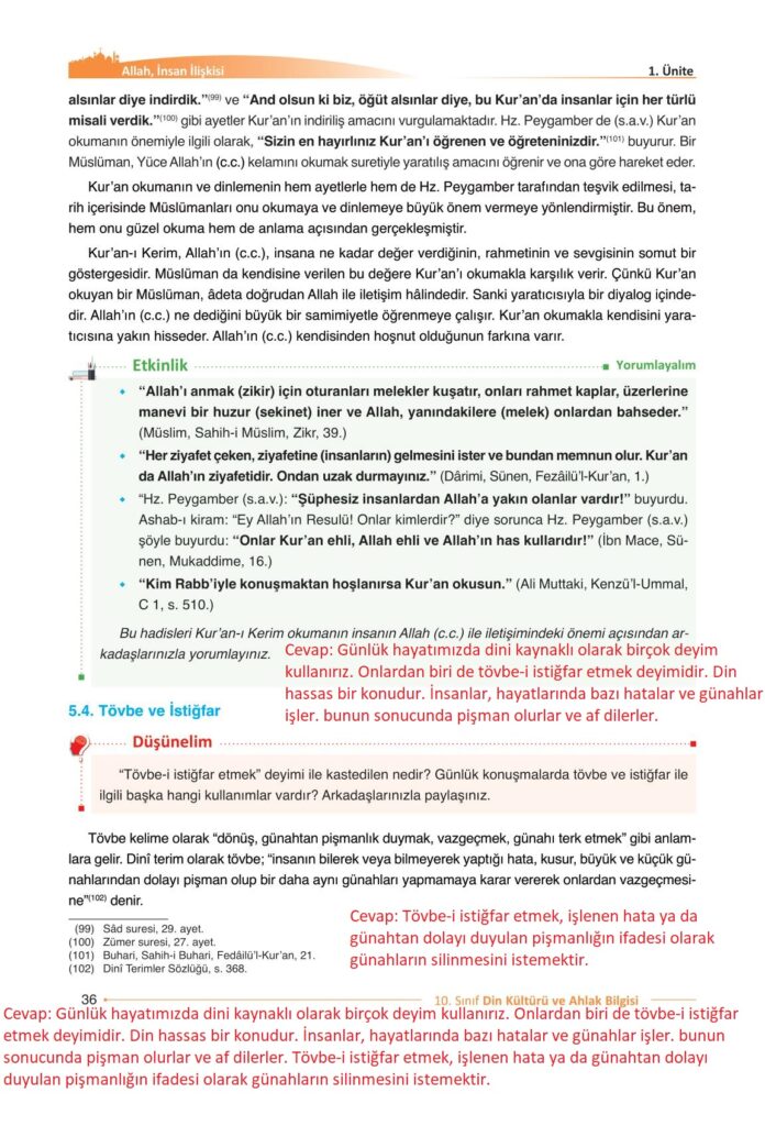10. SINIF DERS KİTABI CEVAPLARI TÜM DERSLER
