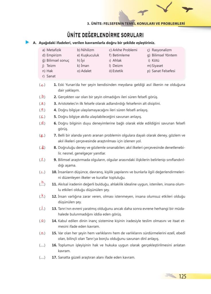 10. Sınıf Felsefe Ders Kitabı Bilim ve Kültür Yayınları Sayfa 125 Cevapları