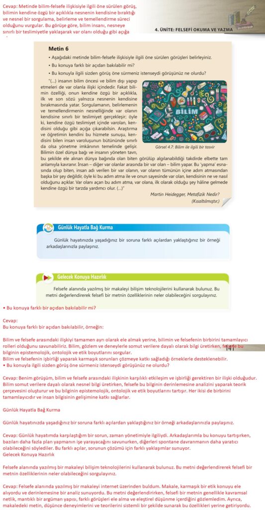 10. Sınıf Felsefe Ders Kitabı Bilim ve Kültür Yayınları Sayfa 141 Cevapları