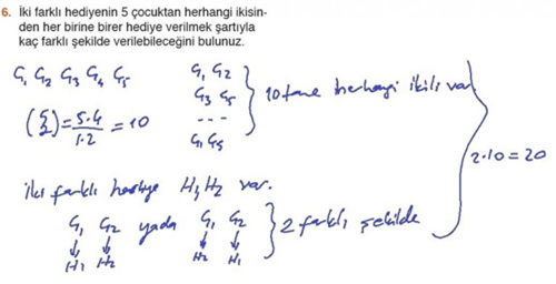 6. İki farklı hediyenin 5 çocuktan herhangi ikisinden her birine birer hediye verilmek şartıyla kaç farklı şekilde verilebileceğini bulunuz.
