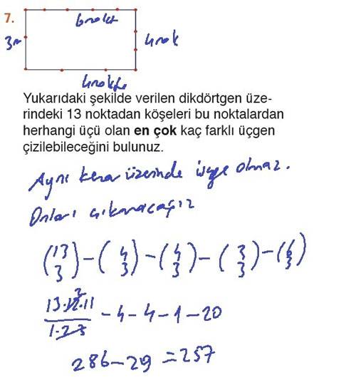 Yukarıdaki şekilde verilen dikdörtgen üzerindeki 13 noktadan köşeleri bu noktalardan herhangi üçü olan en çok kaç farklı üçgen çizilebileceğini bulunuz.