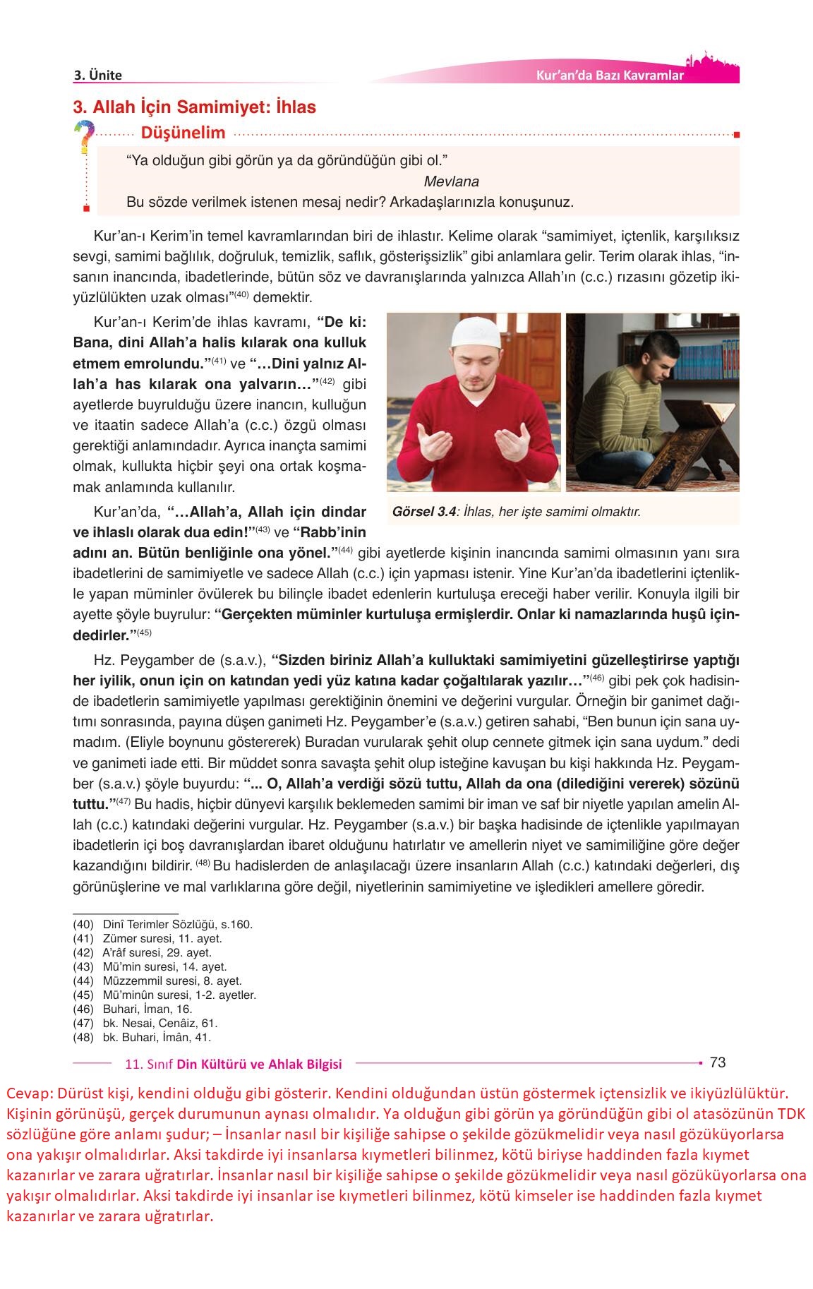 11. Sınıf Din Kültürü ve Ahlak Bilgisi Ders Kitabı Gezegen Yayınları Sayfa 73 Cevapları