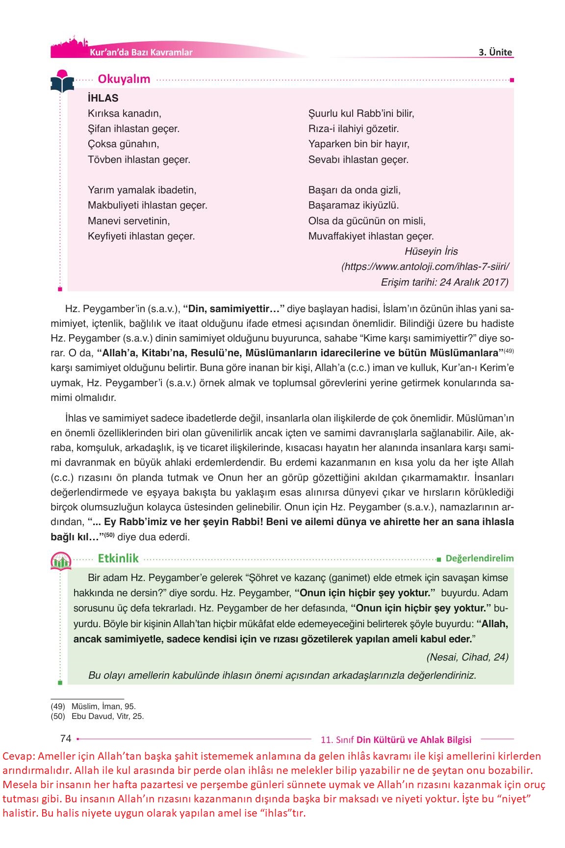 11. Sınıf Din Kültürü ve Ahlak Bilgisi Ders Kitabı Gezegen Yayınları Sayfa 74 Cevapları