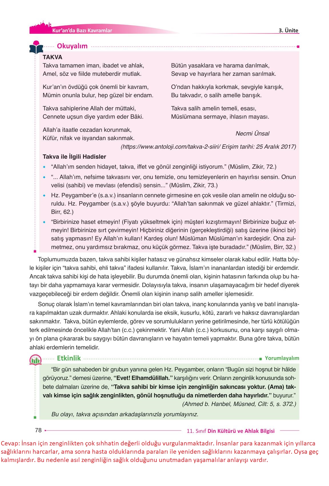 11.sınıf din kültürü ve ahlak bilgisi ders kitabı gezegen yayınları sayfa 78 cevap anahtarı cevabı sayfa olarak çözümlerini yanıtları sizler için sunduk. Tüm ders kitabı cevapları gelecek yıl yine sitemizde olacak.