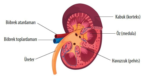 Şekilde kabuk yani korteks, öz yani medulla ve havuzcuk yani pelvis görülmekte.