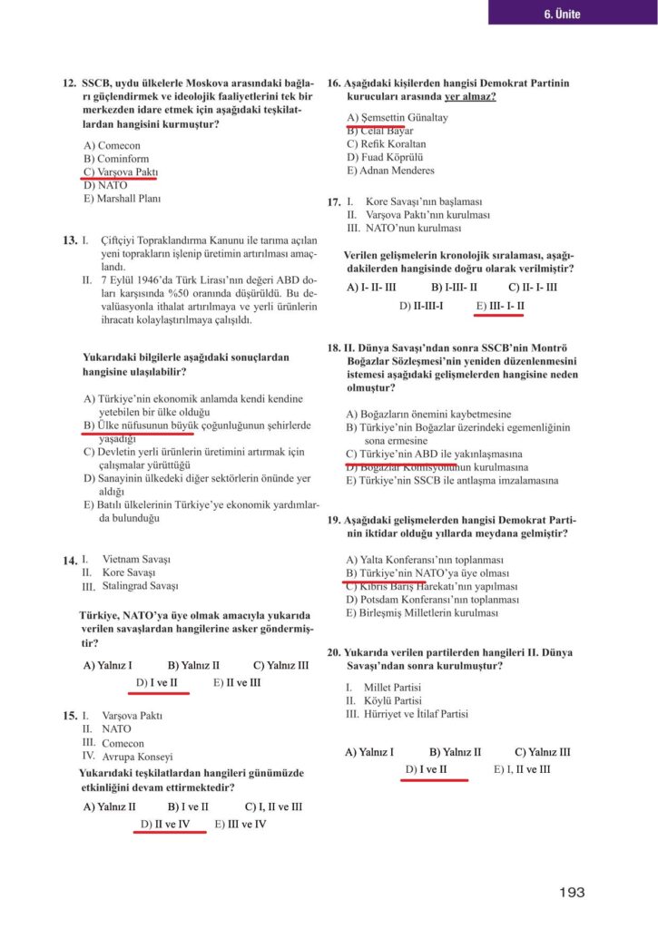 12. Sınıf İnkılap Tarihi Meb Yayınları Sayfa 193 Cevapları / Cevabı