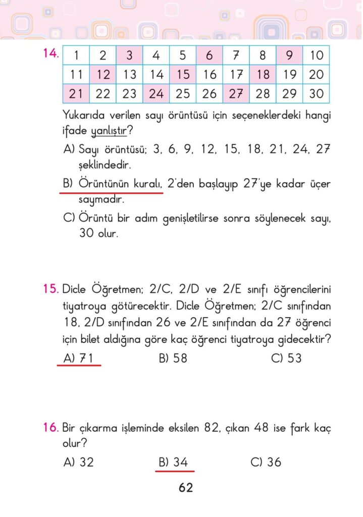 2. sınıf matematik ders kitabı pasifik yayınları sayfa 62 cevap anahtarı 2022-2023 sayfa olarak çözümlerini yanıtları sizler için aşağıda sunduk. 2025-2026 pasifik yayınları matematik ders kitabı cevapları yine sitemizde olacak.