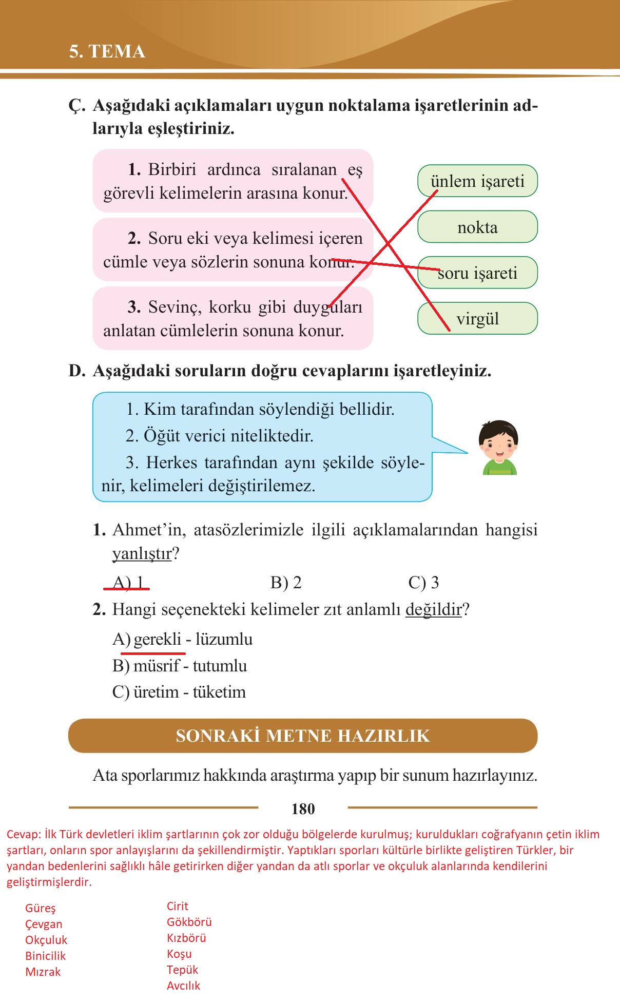 2. Sınıf Türkçe Ders Kitabı Bilim ve Kültür Yayınları Sayfa 180 Cevapları