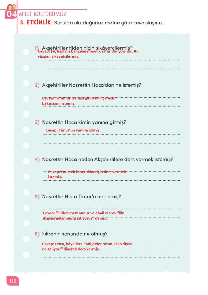 3. Sınıf Türkçe Meb Yayınları Sayfa 112 Cevapları / Cevabı