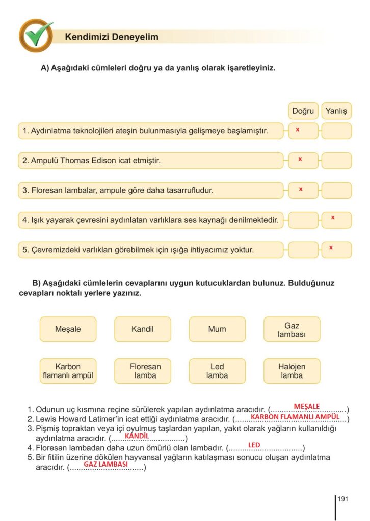 4. Sınıf Fen Bilimleri Meb Yayınları Sayfa 191 Cevapları / Cevabı