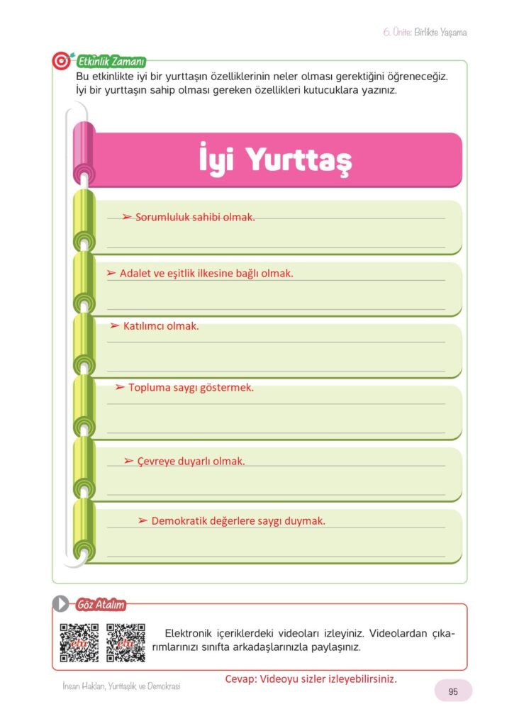 4.sınıf insan hakları, yurttaşlık ve demokrasi ders kitabı hecce yayıncılık sayfa 95 cevap anahtarı cevabı sayfa olarak çözümlerini yanıtları sizler için sunduk. Tüm ders kitabı cevapları gelecek yıl yine sitemizde olacak.