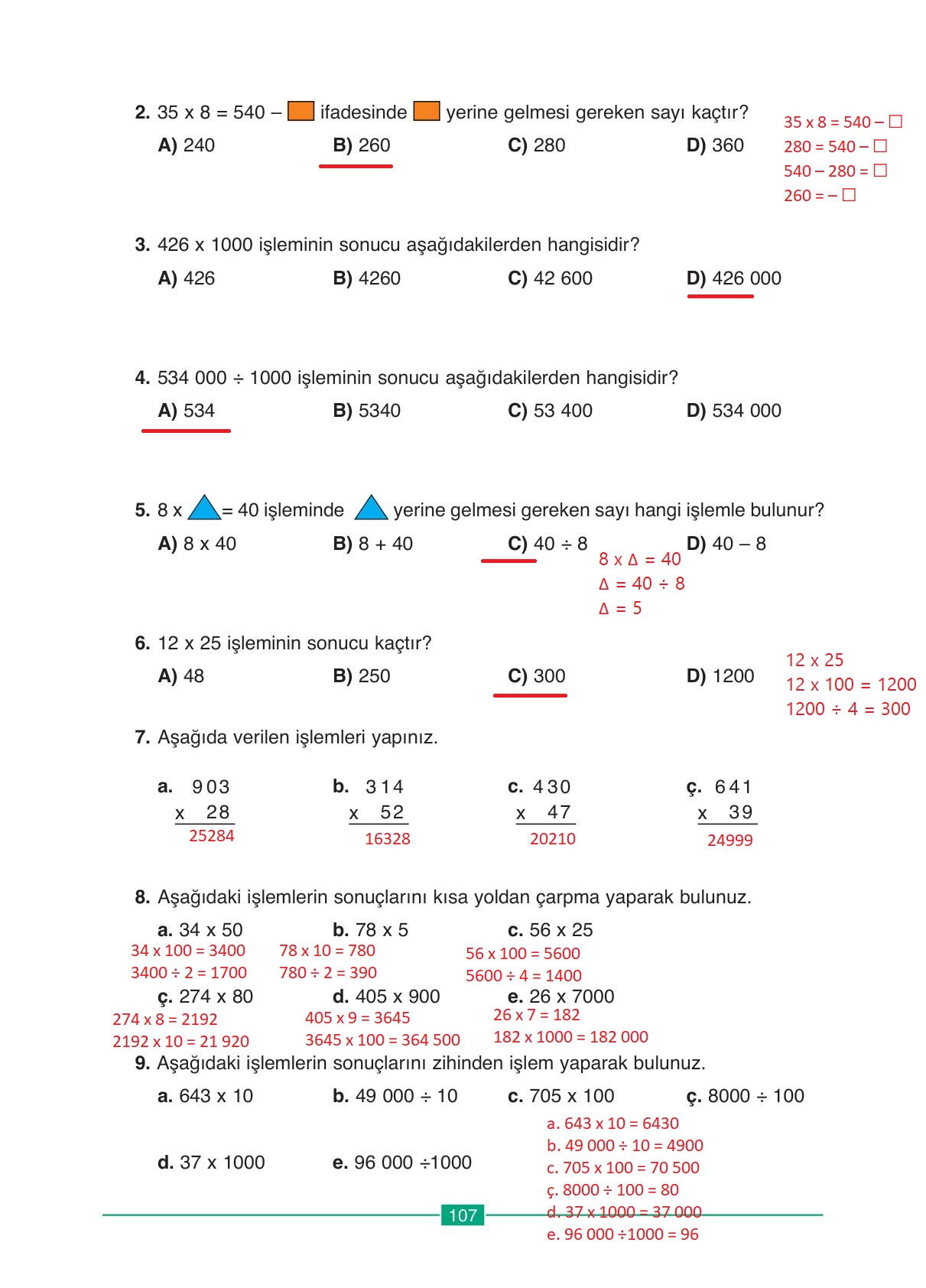 4. Sınıf Matematik Ders Kitabı Ada Yayınları Sayfa 107 Cevapları