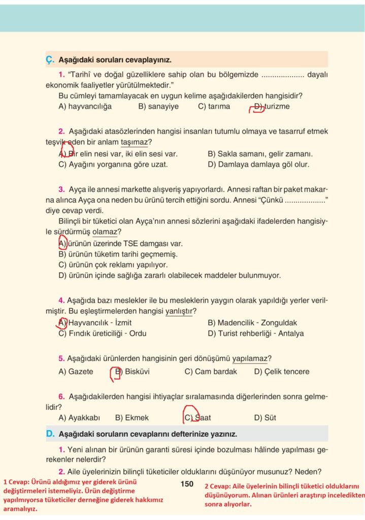 4. Sınıf Sosyal Bilgiler Tuna Yayınları Sayfa 150 Cevapları / Cevabı