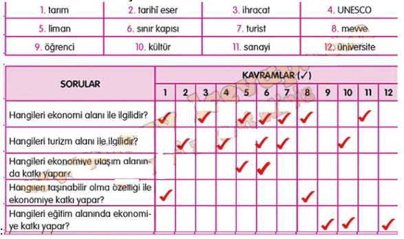 Aşağıdaki soruları kutucuklarda verilen kavramlarla sayıları kullanarak cevaplayınız. Her ifadeyi birden fazla soru ile ilişkilendirebilirsiniz.