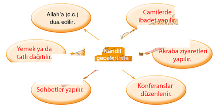 Kandil geceleri evinizde, çevrenizde nasıl kutlanmakta, bu gecelerde neler yapılmaktadır? Yukarıdaki şemaya gözlemlerinizi ve izlenimlerinizi yazınız.