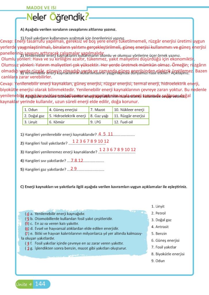 6.Sınıf Fen Meb Yayınları Sayfa 144 Cevabı