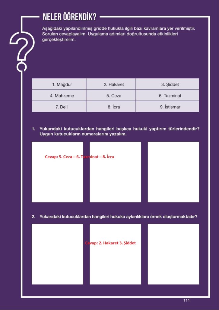 6. Sınıf Hukuk ve Adalet Meb Yayınları Sayfa 111 Cevapları / Cevabı