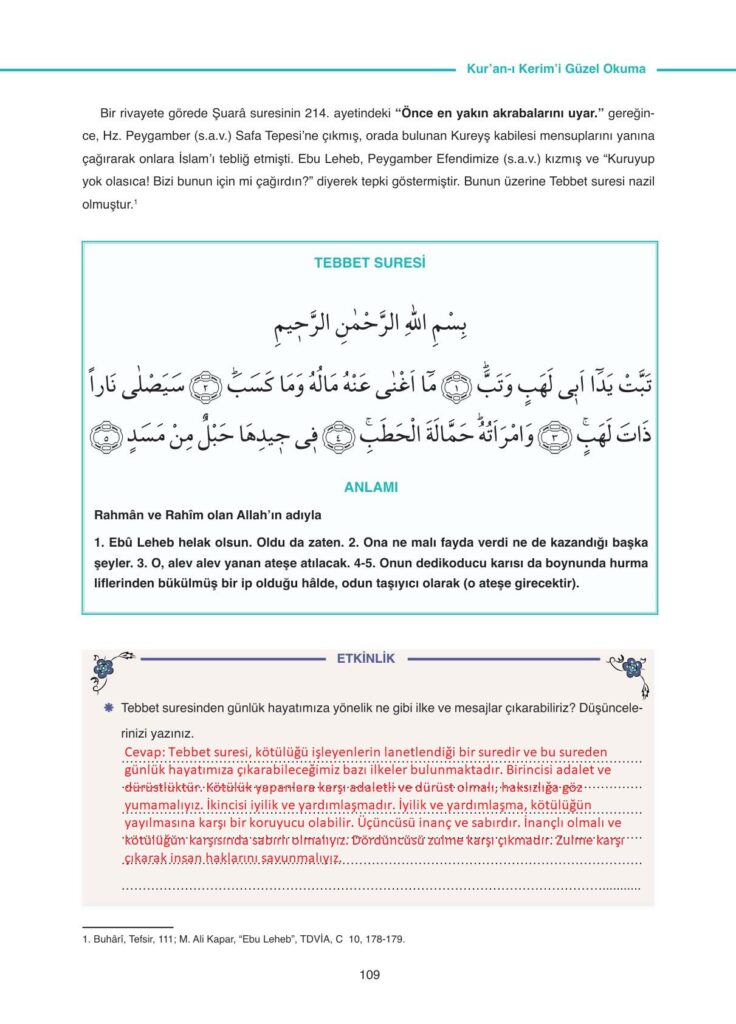 6. Sınıf Kuran-ı Kerim Ders Kitabı Anka Yayınları Sayfa 109 Cevapları