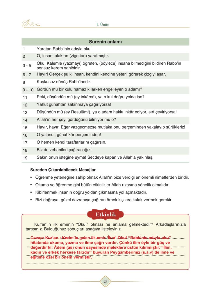 6. Sınıf Kur’an-ı Kerim Semih Ofset Yayınları Sayfa 28 Cevapları / Cevabı