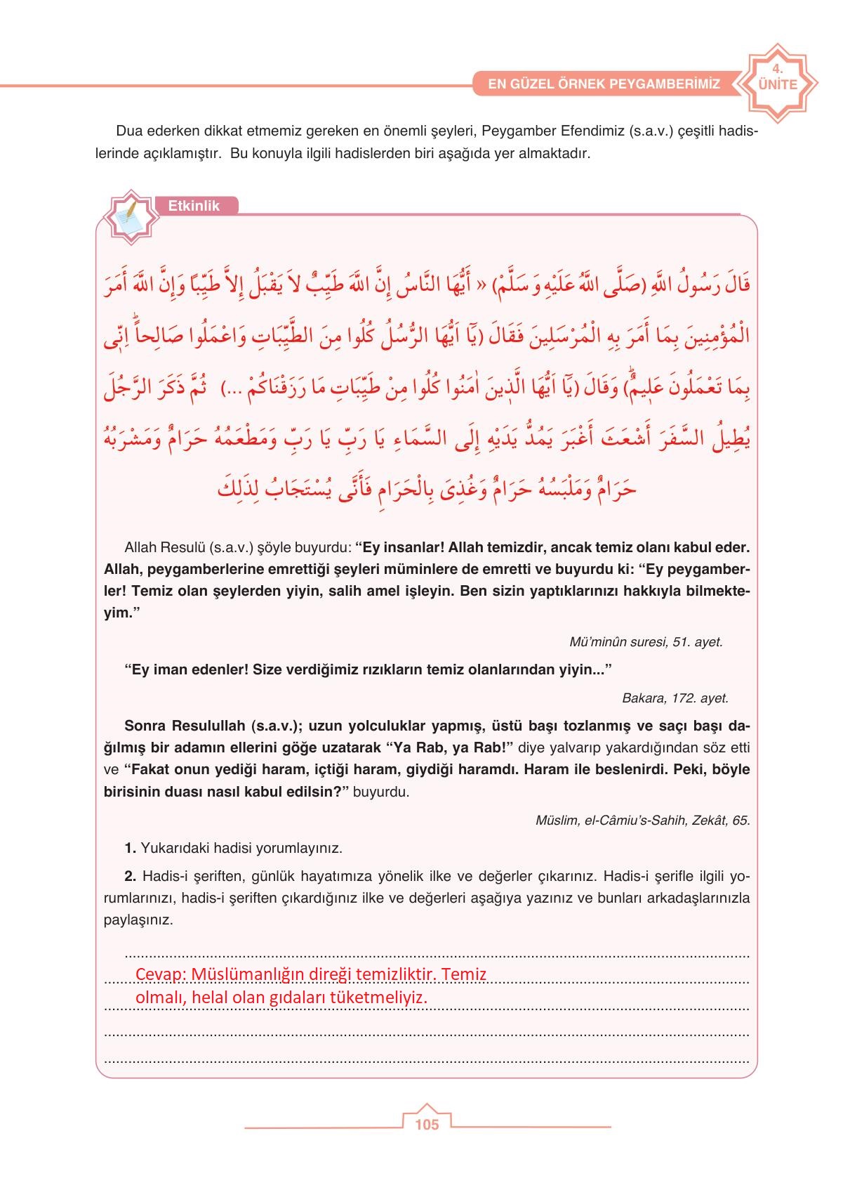 6. Sınıf Peygamberimizin Hayatı Tutku Yayıncılık Sayfa 105 Cevapları / Cevabı