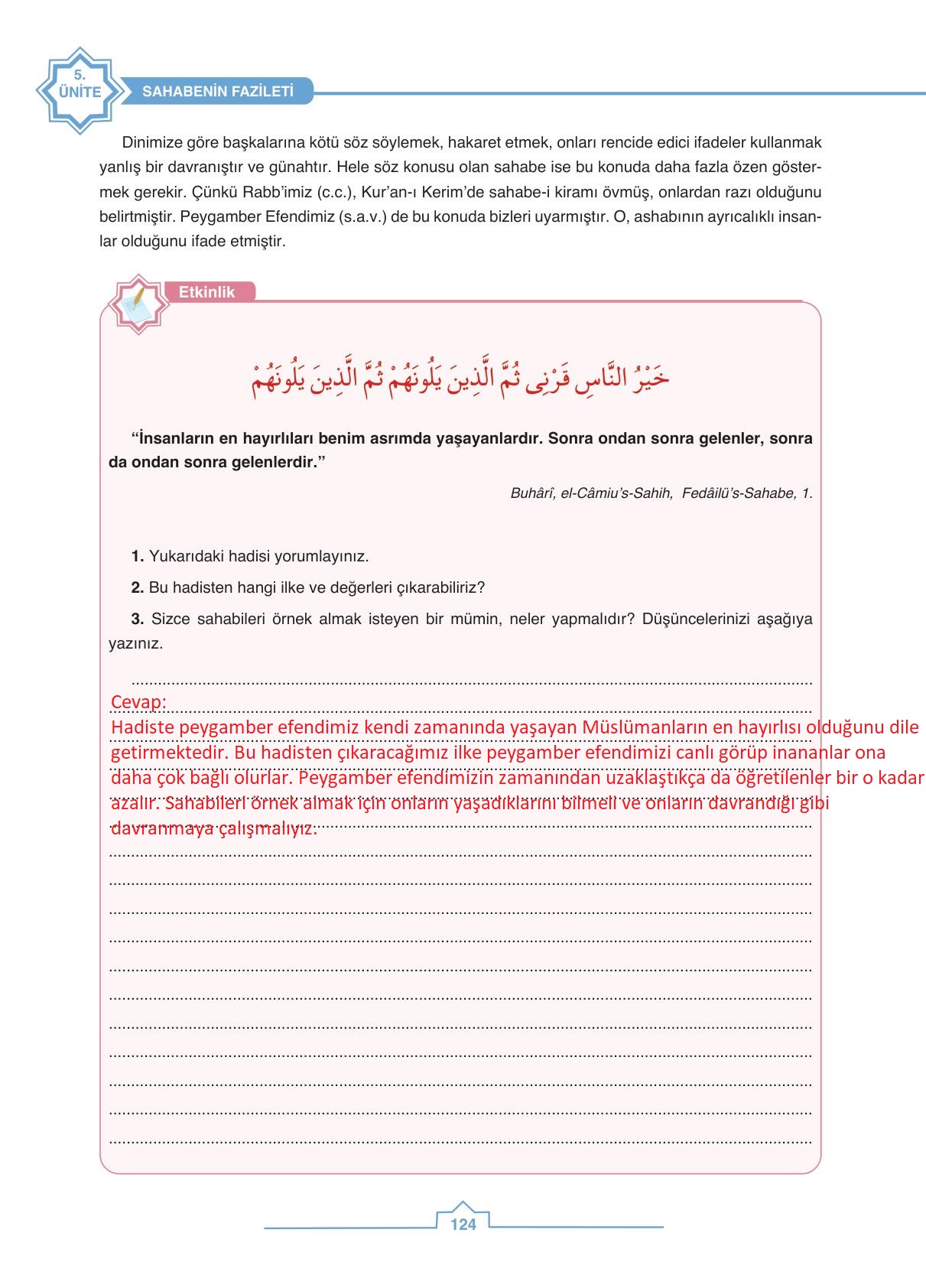 6. Sınıf Peygamberimizin Hayatı Tutku Yayıncılık Sayfa 124 Cevapları / Cevabı