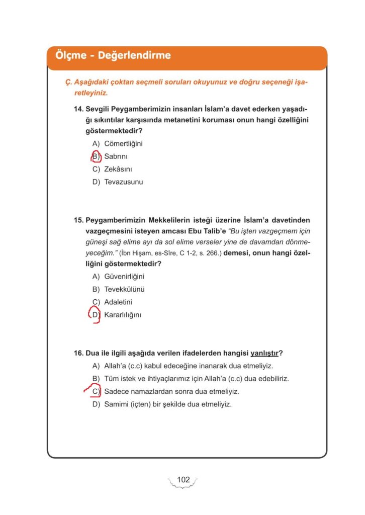 6. Sınıf Peygamberimizin Hayatı Meb Yayınları Sayfa 102 Cevapları / Cevabı
