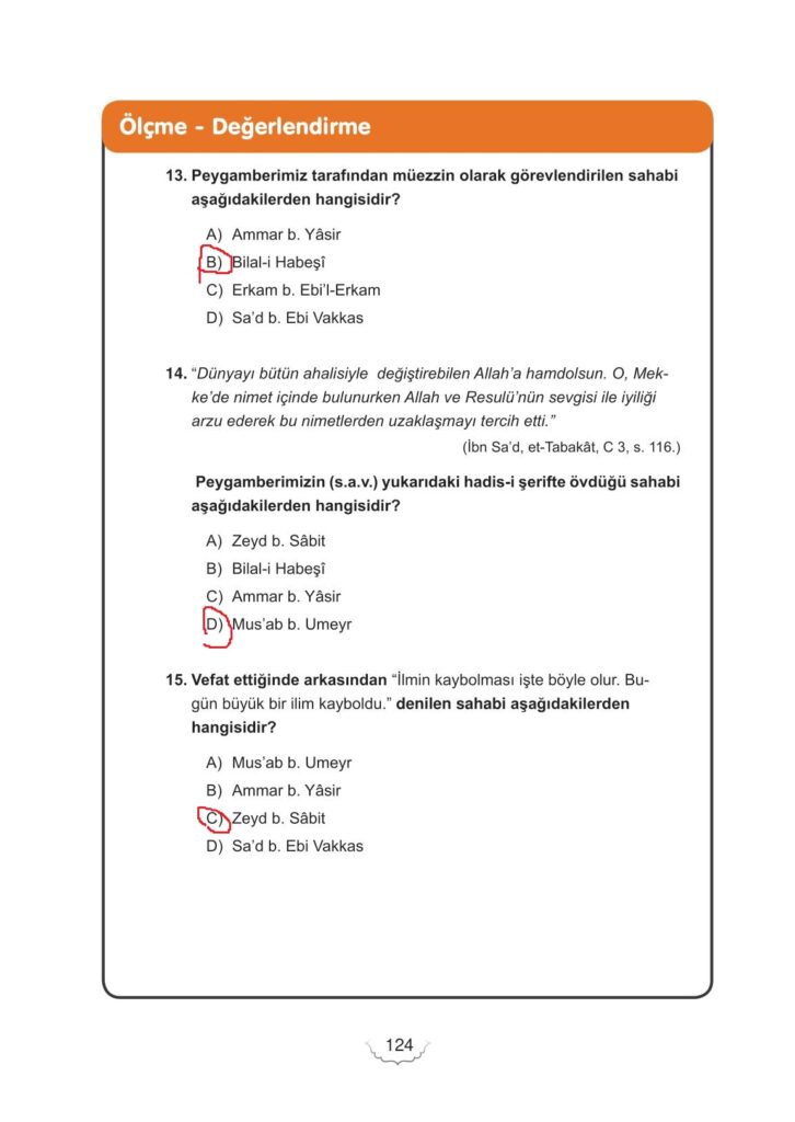 6. Sınıf Peygamberimizin Hayatı Meb Yayınları Sayfa 124 Cevapları / Cevabı
