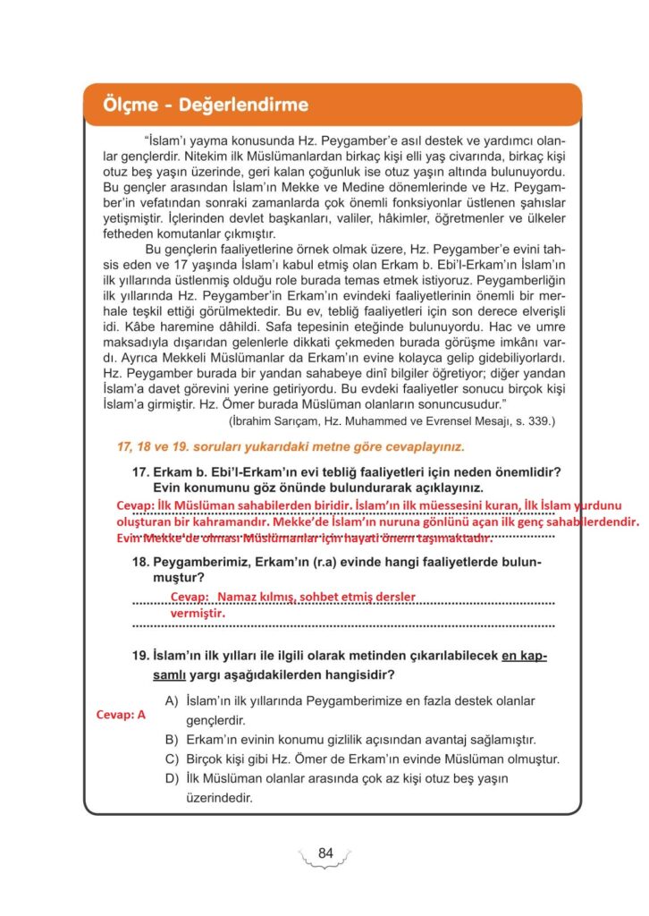 6. Sınıf Peygamberimizin Hayatı Meb Yayınları Sayfa 84 Cevapları / Cevabı