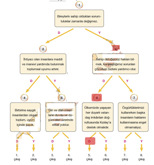 B. Aşağıdaki dallanmış ağaç etkinliğinde okuduğunuz ifade doğru ise “D”, yanlış ise “Y” yönünde ilerleyiniz. Buna göre aşağıdaki soruların cevaplarını defterinize yazınız.