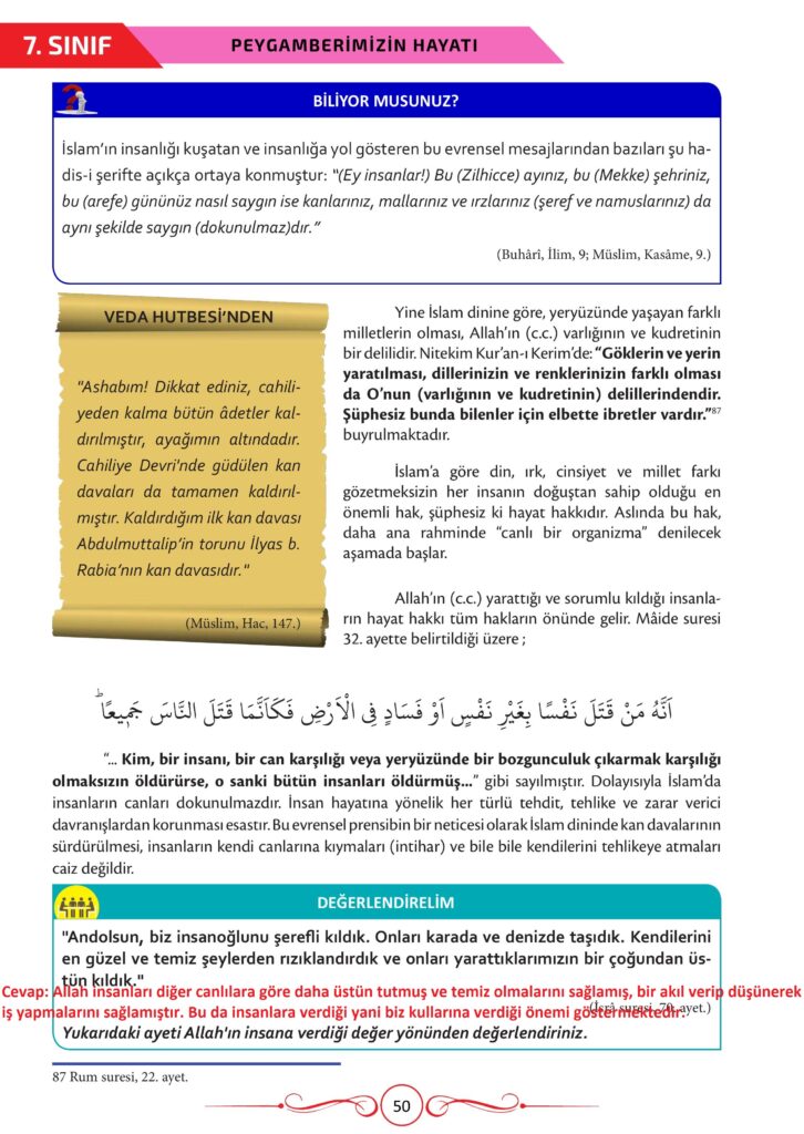 7. Sınıf Peygamberimizin Hayatı Meb Yayınları Sayfa 50 Cevapları / Cevabı