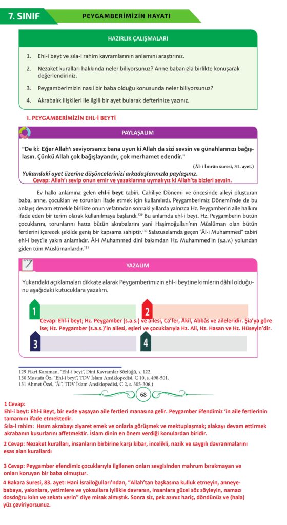 7. SINIF PEYGAMBERİMİZİN HAYATI MEB YAYINLARI DERS KİTABI CEVAPLARI TÜM SAYFALAR