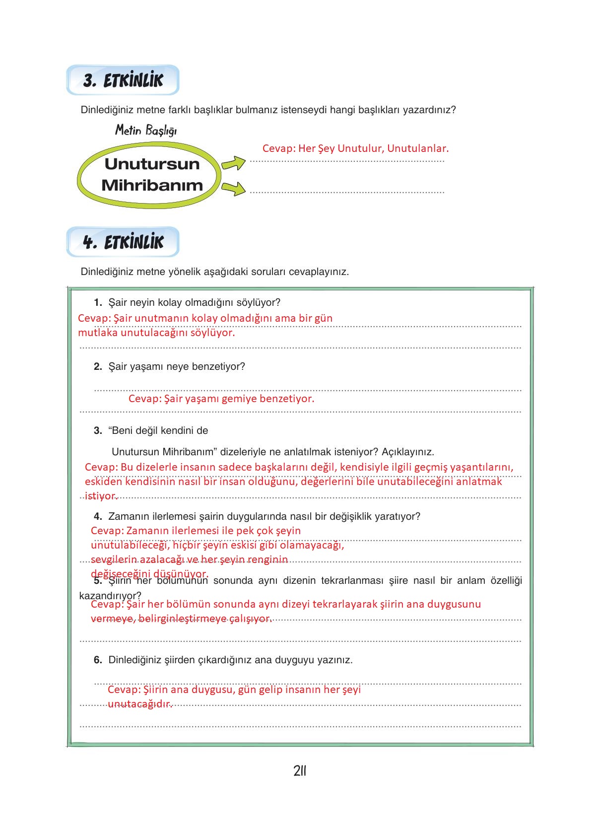 7.sınıf türkçe ders kitabı dörtel yayınları sayfa 211 cevap anahtarı cevabı sayfa olarak çözümlerini yanıtları sizler için sunduk. Tüm ders kitabı cevapları gelecek yıl yine sitemizde olacak.