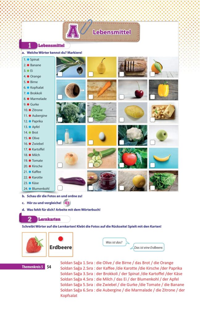 9. sınıf almanca A1.1 ders kitabı cevapları koza yayınları sayfa 54 cevap anahtarı 2022-2023 sayfa olarak çözümlerini yanıtları sizler için aşağıda sunduk. 2025-2026 koza yayınları almanca A1.1 ders kitabı cevapları yine sitemizde olacak.