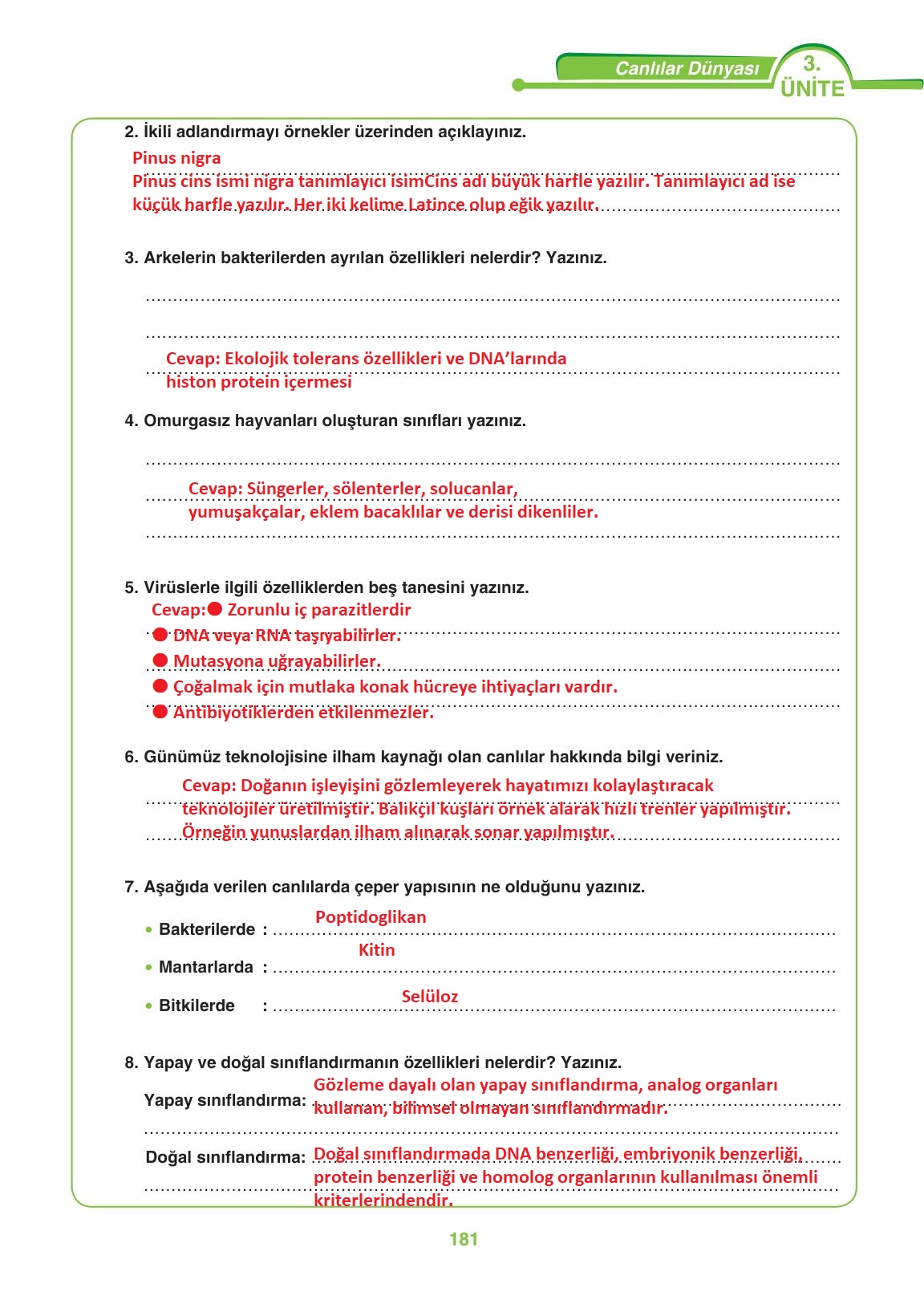 9. Sınıf Biyoloji Ders Kitabı Tutku Yayınları Sayfa 181 Cevapları