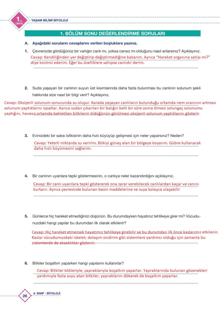 9. Sınıf Biyoloji Ez De Yayıncılık Sayfa 26 Cevapları / Cevabı