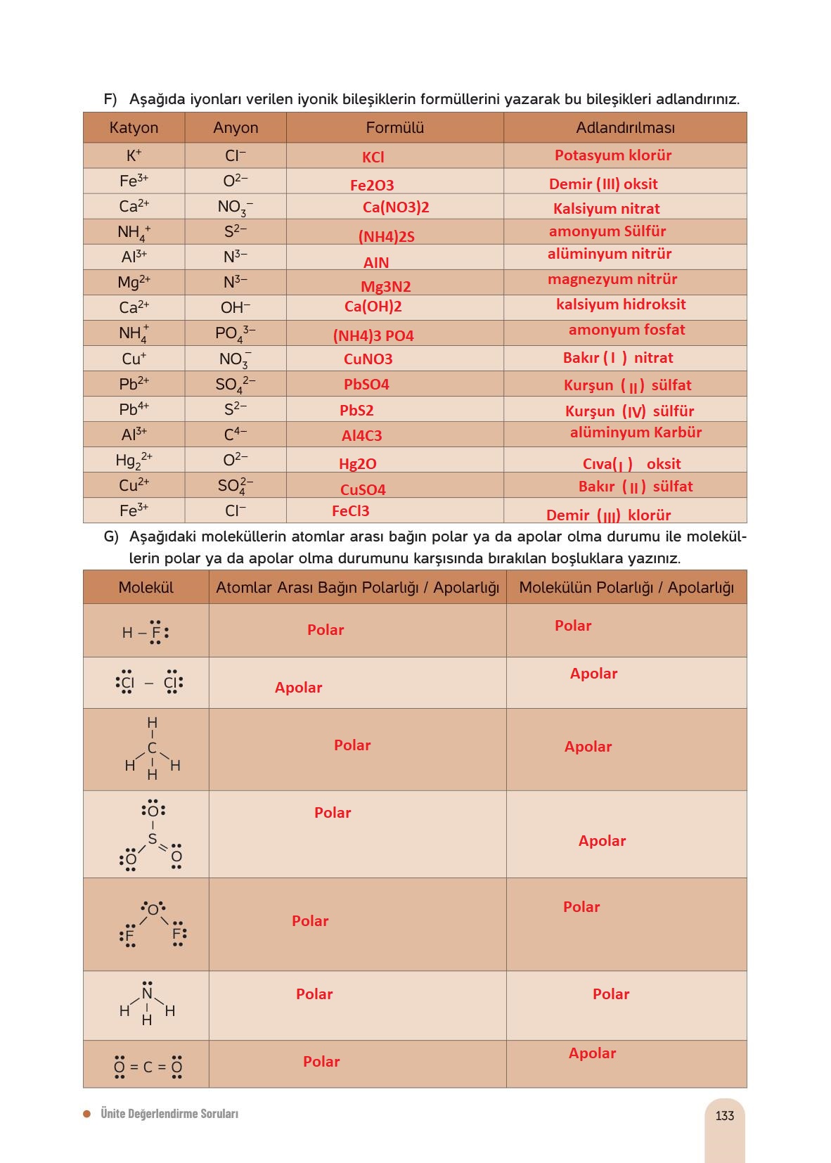 9. Sınıf Kimya Ders Kitabı Hecce Yayınları Sayfa 133 Cevapları