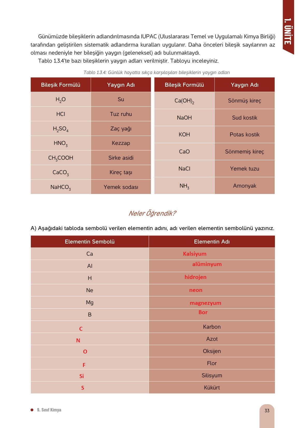 9. Sınıf Kimya Ders Kitabı Hecce Yayınları Sayfa 33 Cevapları